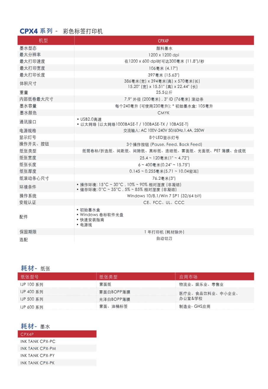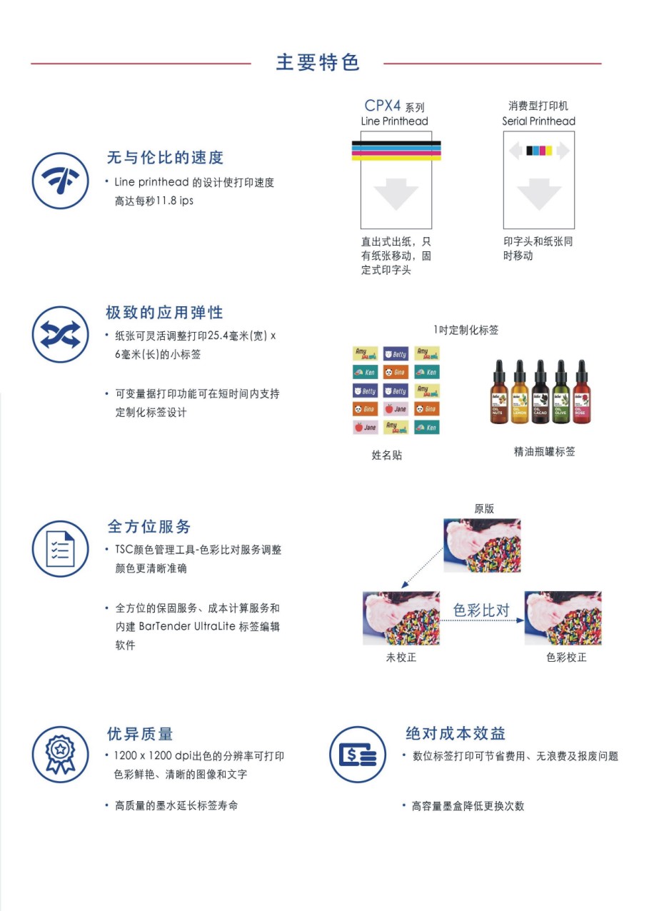 ?打印速度最快可達(dá)每秒11.8 ips ?最高分辨率1200 x 1200 dpi ?可調(diào)整紙張寬度1 英寸到4.72 英寸之間 ?TSC顏色管理工具可 精確比對顏色?一年保固 ?支持多種紙張類型 ?高速和高效能的USB和以太網(wǎng)絡(luò)接口 ?高容量墨盒