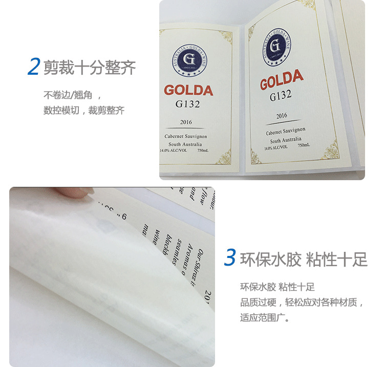 產(chǎn)品名稱:酒類不干膠標(biāo)簽紙 顏色:單色、四色、專色 使用膠型:油膠、水膠、熱熔膠 規(guī)格:根據(jù)客戶自己定制 形狀:圓形、長方形、橢圓形、自定義形狀等 使用底紙:黃色離型紙,白色離型紙,白色格拉辛等 材質(zhì):鏡面不干膠,PVC不干膠,易碎紙,銅板不干膠,牛皮紙等