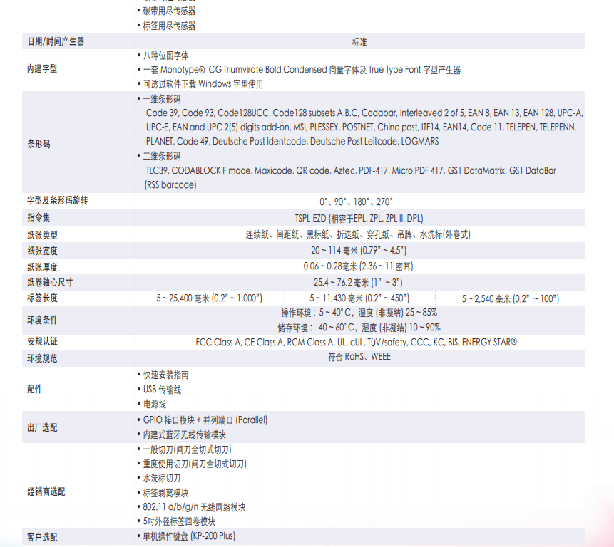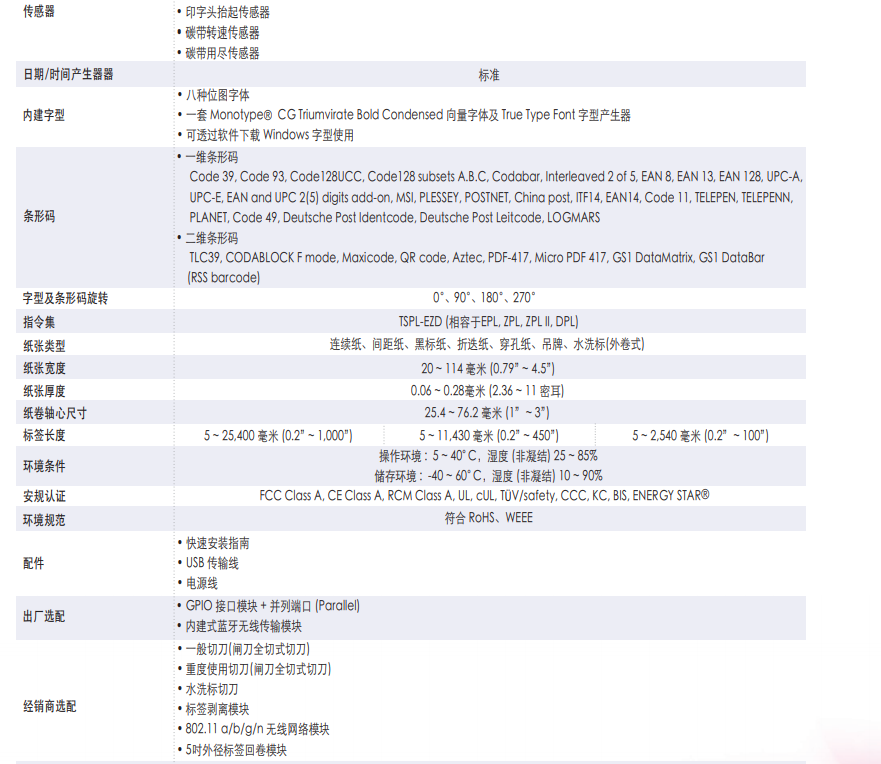 完整的選購配件:標簽剝離模組、GPIO介面模組、藍牙無線傳輸模組、802.11 a/b/g/n 無線網路模組、多款切刀選擇
