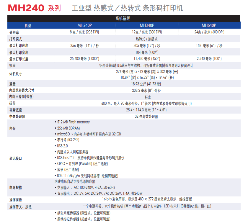 支援小標簽剝離- 最小長度達0.5吋(MH240/MH340/MH640 和MH240T/MH340T/MH640T)