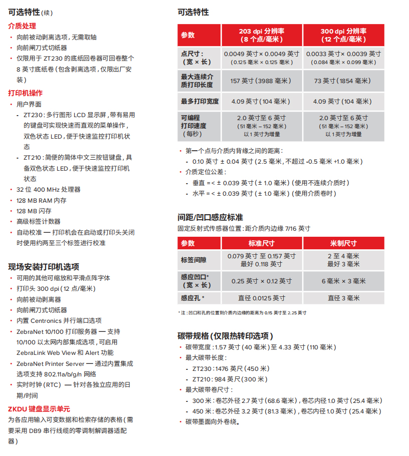 以下規(guī)格僅供參考,并且基于使用Zebraa? 原廠耗材對 ZT200? 工業(yè)系列打印機(jī)所進(jìn)行的測試。測試的結(jié)果會(huì)因?qū)嶋H的應(yīng)用設(shè)置或使用非建議的Zebra品牌耗材而存在差異。Zebra始終建議通過測試來檢驗(yàn)應(yīng)用。
